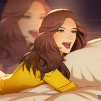 a young woman with long dark hair. She appears to be lying on her stomach and smiling broadly. Her hands are placed on the pillows behind her head, suggesting she's in a relaxed or playful pose. There is
