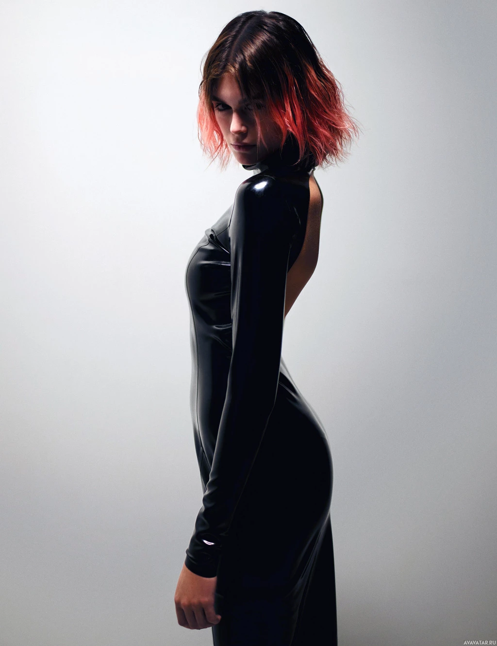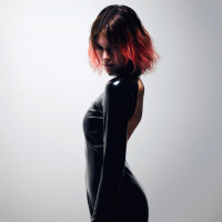 The picture shows a person wearing a black leather bodysuit. The individual has short hair with red highlights and is posed in a way that suggests confidence and strength.