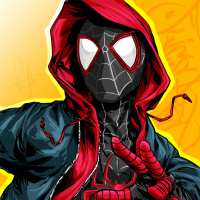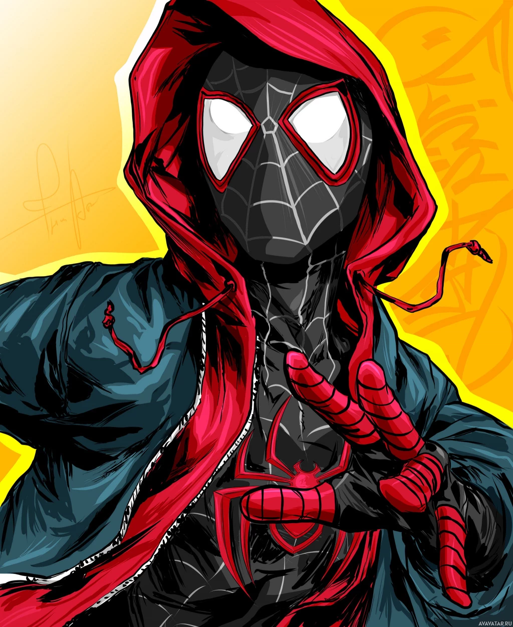 spider emblems on both his chest and back. In this particular depiction, Spider-Man is wearing a hood that covers his head. The style of the artwork leans towards