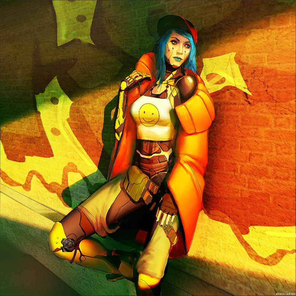 blue hair, styled in a punk or cyberpunk fashion. The individual is wearing