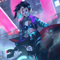 futuristic clothing and accessories, giving off a cyberpunk or sci-fi vibe. There are