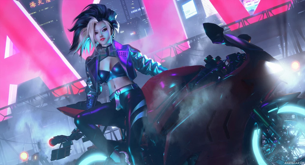 the back of a motorcycle in what appears to be an energetic or concert-like setting. The character is styled with
