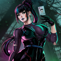 black hair styled in twin tails, and she's holding what looks like a playing card between her fingers. Her expression is confident, and there are futuristic elements such as