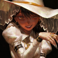 На картинке изображен иллюстрированный персонаж, девушка в шляпе ведьмы. У нее темные волосы и костюм, который включает в себя платье с оборками на плечах и, возможно, другие аксессуары, такие как серьги или браслеты. У персонажа игривое или озорное выражение лица.