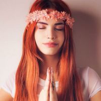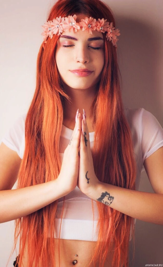 red hair who appears to be in a peaceful or meditative pose. They have closed eyes and are holding their hands together in front of them, which could be indicative of a prayer or meditation gesture. The individual is wearing a garland of