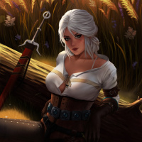 art form rather than an in-game screenshot. Ciri is portrayed with