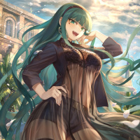 fantasy outfit, with a cape and a dress that suggests a period or fantasy setting. The background includes elements such as