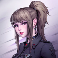 The image shows a stylized illustration of a female character. She has a stern expression on her face and is wearing what appears to be a military-style uniform with badges on the shoulders, suggesting that she might have a role in law enforcement or security. Her hair is pulled back into a ponytail, and she's accessorized with earrings. There are also some insignia or logos visible in her attire. The overall style of the image gives it a graphic novel-like feel.
