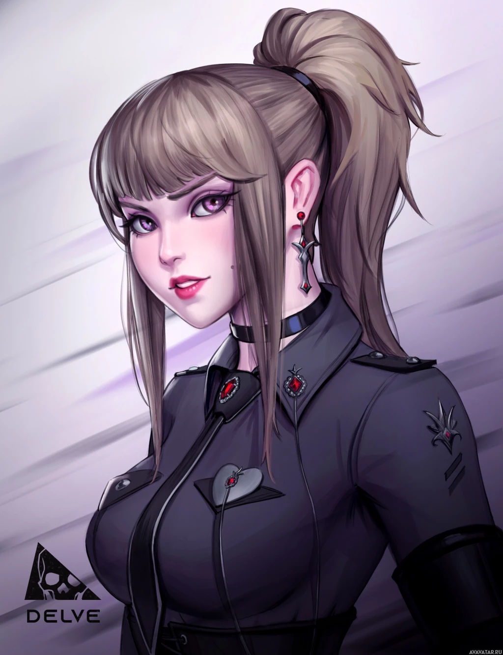 На картинке изображена стилизованная иллюстрация женского персонажа. У нее суровое выражение лица, и она одета в форму, напоминающую военную, со значками на плечах, что позволяет предположить, что она, возможно, работает в правоохранительных органах или службе безопасности. Ее волосы собраны на затылке в конский хвост, а в качестве аксессуаров на ней надеты серьги. В ее наряде также видны какие-то знаки отличия или логотипы. Общий стиль образа напоминает графический роман.