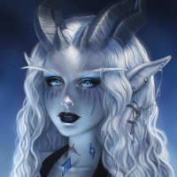 eye makeup and jewelry, contributing to their mystical or demonic look. The color scheme is predominantly dark, which adds