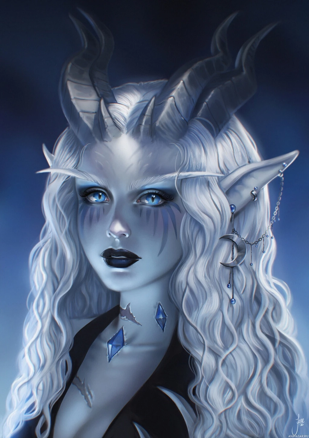 horns on the head, and is wearing makeup that gives them an otherworldly appearance. They are depicted with detailed