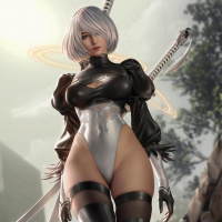a female character from the video game "Nier: Automata." She is depicted in an armored, warrior-like