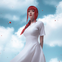 blue sky dotted with fluffy clouds and gentle falling snowflakes, giving the impression of a serene, ethereal environment. The flowers at her feet add a splash of color to the scene, complementing her
