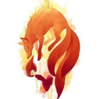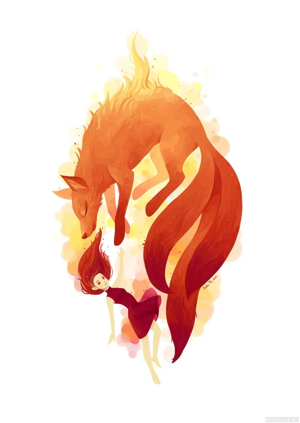red hair that matches the color of the fox's fur. The background features an abstract flame pattern that could be interpreted as fire surrounding the characters, adding