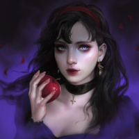 dark hair, holding an apple. The style appears to be influenced by fantasy or gothic themes, given the choice of colors and elements in the composition. The overall