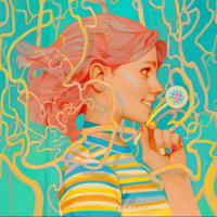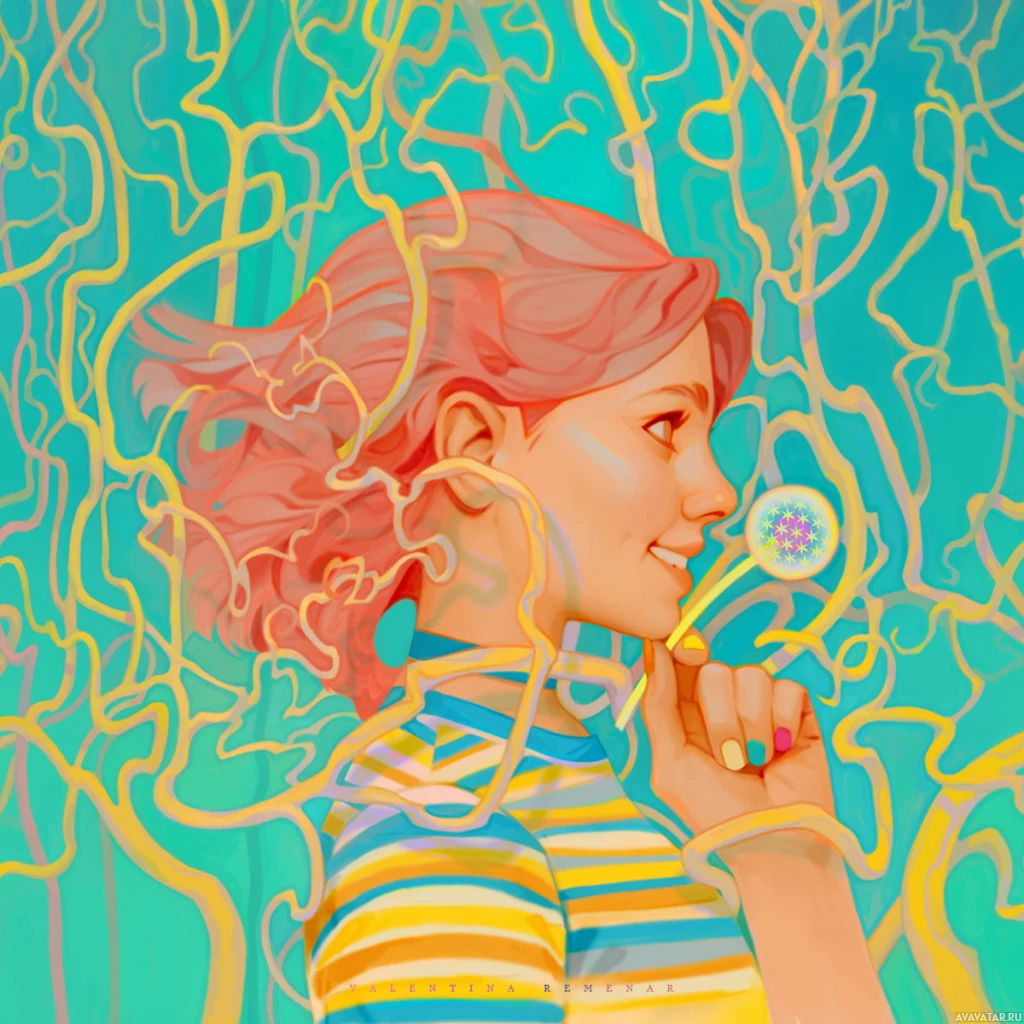 relaxed posture and the bubble she is blowing out of her mouth. The background has a fantastical element, featuring yellow tendrils or roots that resemble