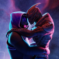 a humanoid figure wearing an armor with a hood, which is characteristic of the character Tali. On the right, there's another figure that resembles a large, reptilian-like creature known as a Reaper or a Harbinger in Mass Effect context, often associated with Sovereign. The characters are depicted in