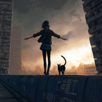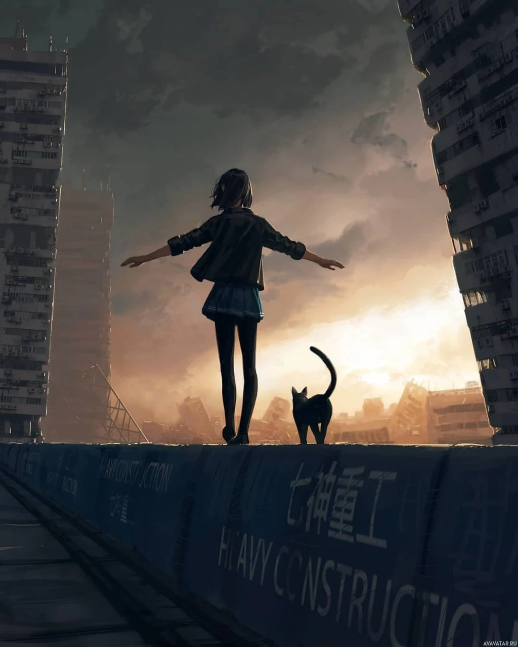 a young girl standing on what appears to be an elevated platform or bridge with her arms outstretched, possibly dancing or enjoying the view. Behind her stands a cat, observing the scene. They are set against a backdrop of a dystopian cityscape with high-rise buildings under a cloudy sky, suggesting