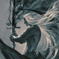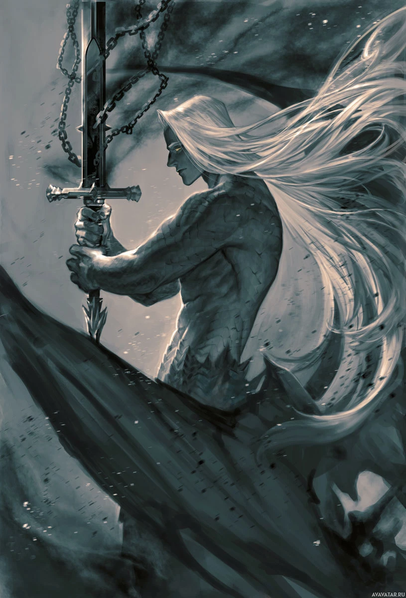 white hair, wielding a sword in his right hand. He appears to be in