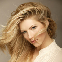 blonde hair. She is wearing a white, lacy top and appears to be looking directly at the camera with her mouth slightly open in a playful or confident manner. Her pose suggests that she is aware of the photograph being taken, possibly posing for a portrait or fashion shoot. The overall impression is one of poise and elegance.