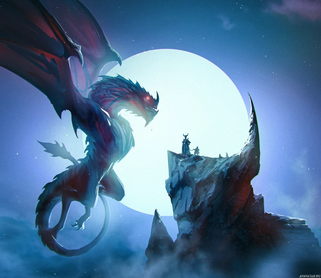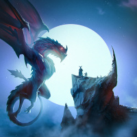 a fantasy scene featuring a large dragon in the sky and several characters below. It appears to be nighttime, as indicated by