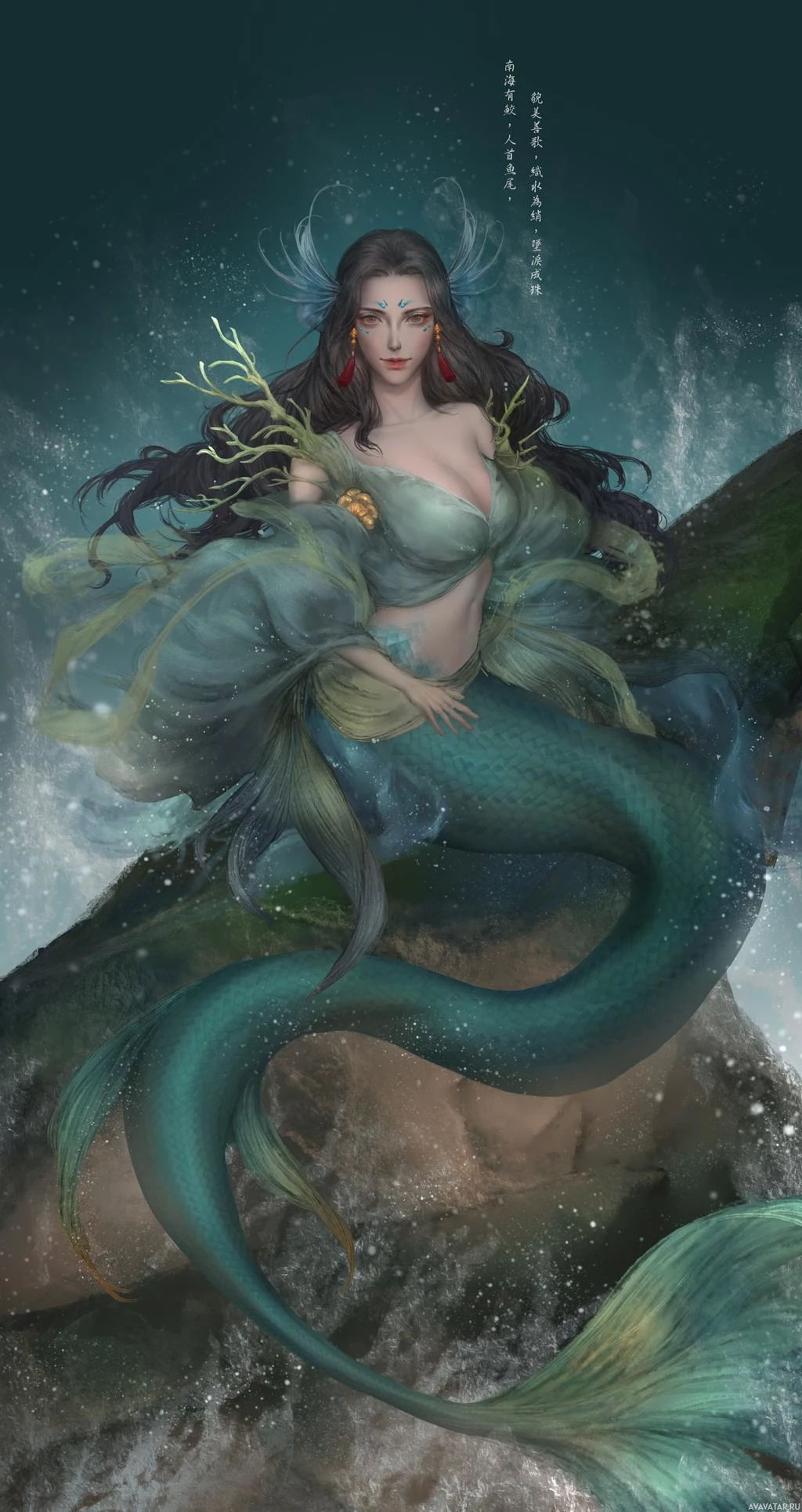 This image depicts an artistic representation of a mermaid in a fantasy-style illustration. The mermaid has long,