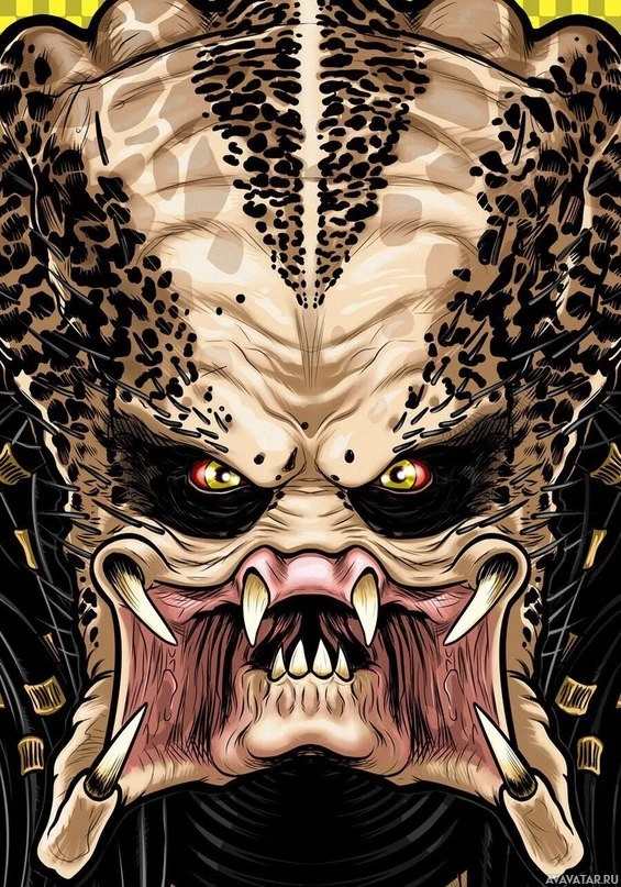 Картинка показывает стилизованное и преувеличенное изображение персонажа Хищника, которое из серии фильмов «Чужой». Это не реальный человек, а цифровое произведение искусства или иллюстрация, предназначенная для творческого представления существа.