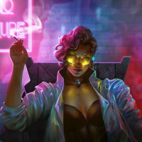edgy look with her outfit consisting of a jacket over a crop top. The artwork has an overall cool and hipster vibe, with the use of pink and black