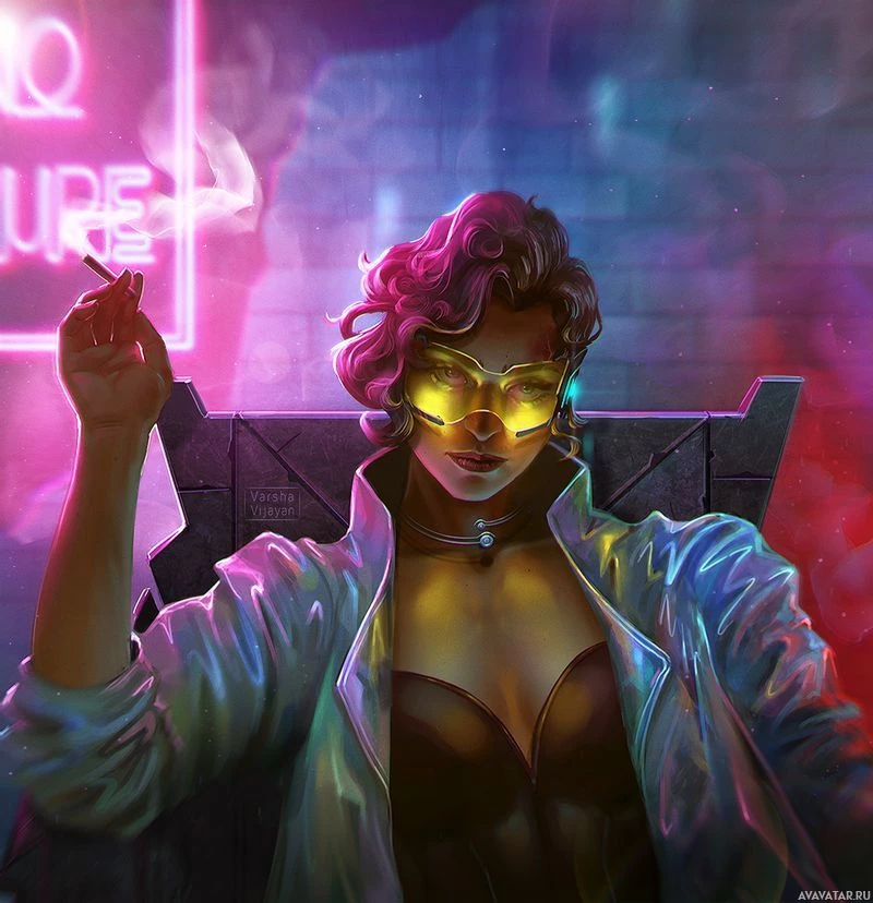 the neon sign in the background that says "SIN". She's wearing glasses and has a modern,