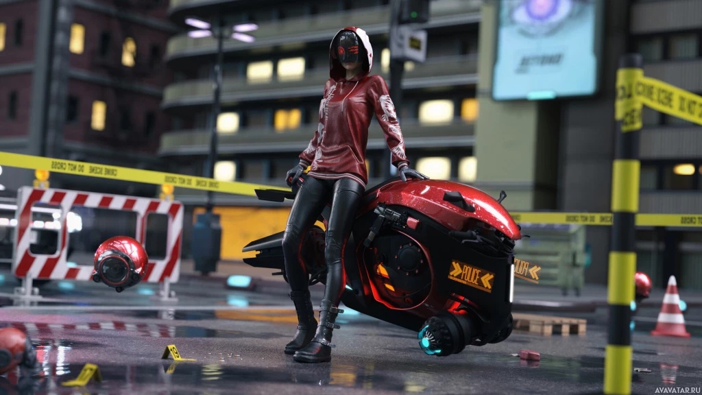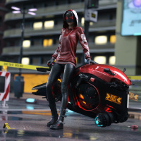 an advanced model, possibly suggesting high-tech elements in this setting. The background suggests an urban environment with buildings and signs that contribute to the science fiction atmosphere. There is a noticeable digital overlay on the image, which could be part of the design or might indicate that the image is from a video game or a digital artwork rather than a photograph taken directly from the real world.
