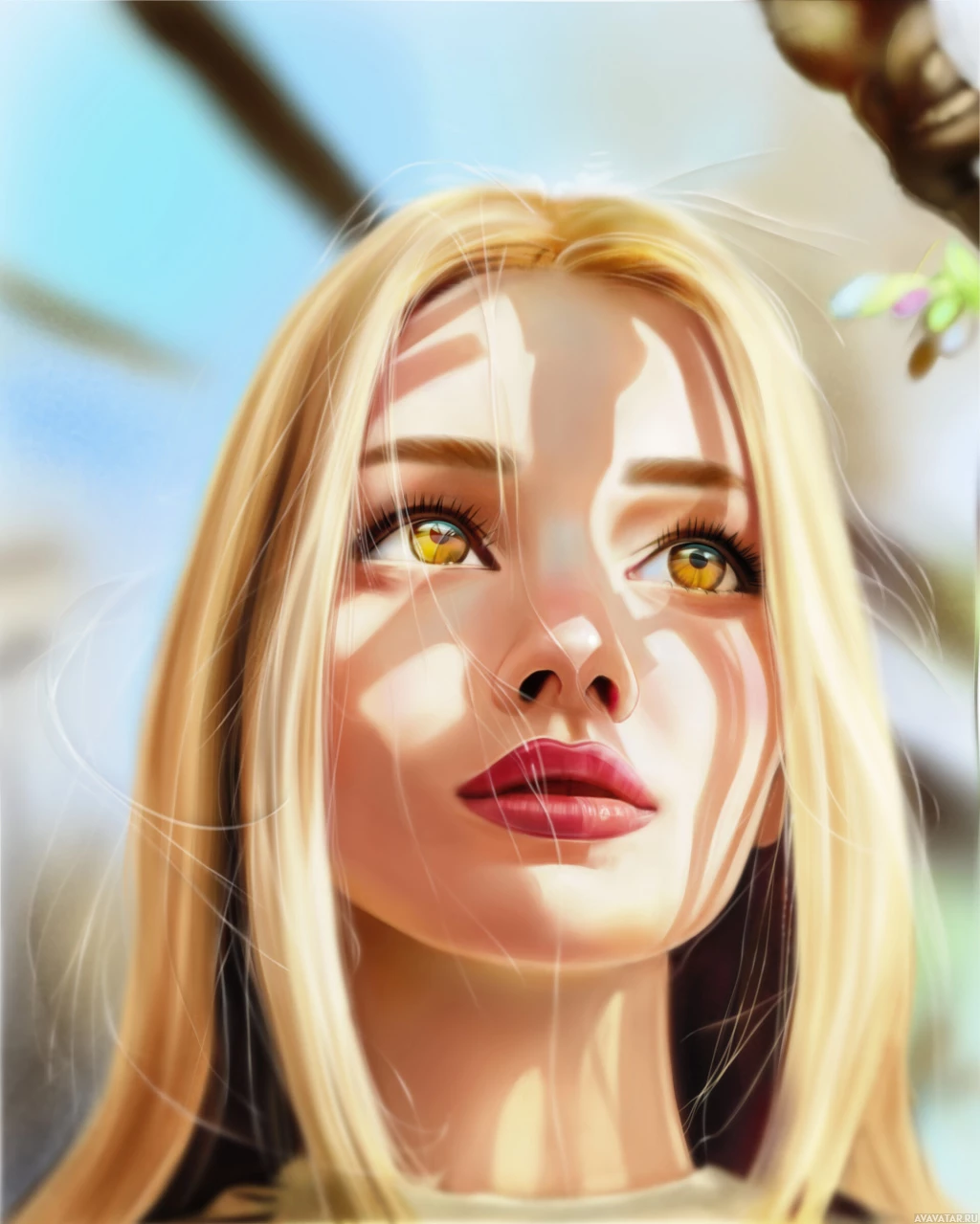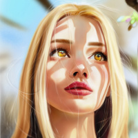 leaves in the background that suggest she might be standing near a tree. Her gaze is directed towards the viewer, giving her a contemplative or thoughtful expression.