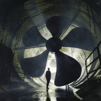a silhouette of a man standing in what appears to be the interior of a large industrial structure, possibly a submarine or a tunnel. A prominent object in the background is