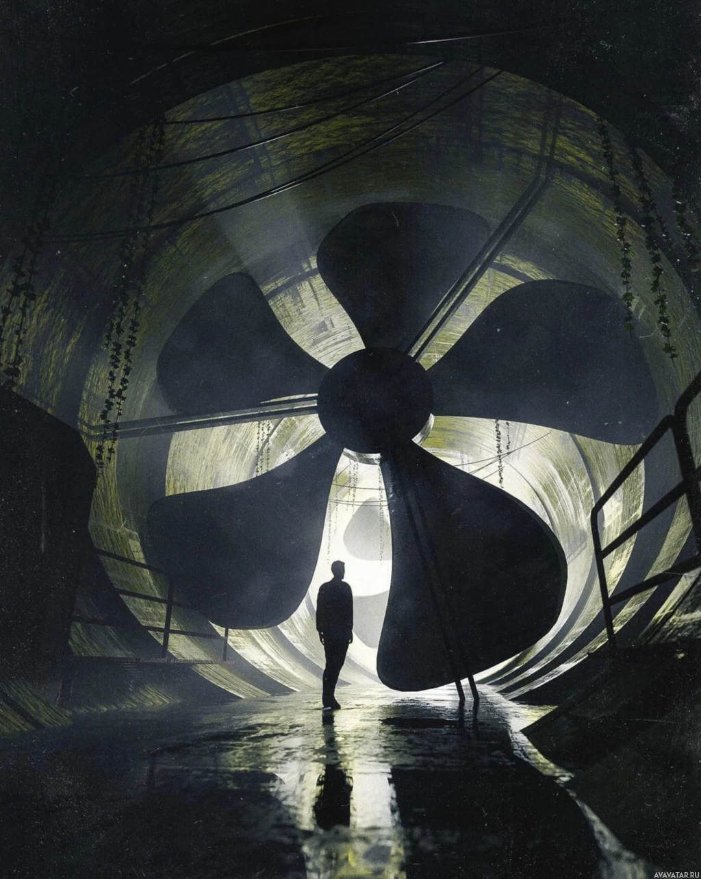 a large fan or propeller. The lighting is dim and moody, with a focus on the person and the machinery in the foreground, which creates