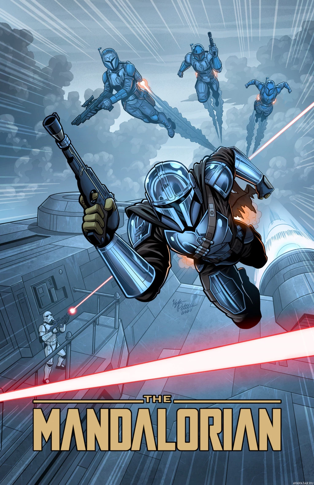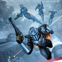 the Star Wars universe, specifically depicting characters in armor reminiscent of the Mandalorians. This scene likely references "The Mandalorian," a popular