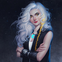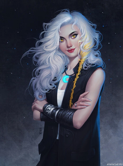 white hair. She is dressed in