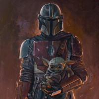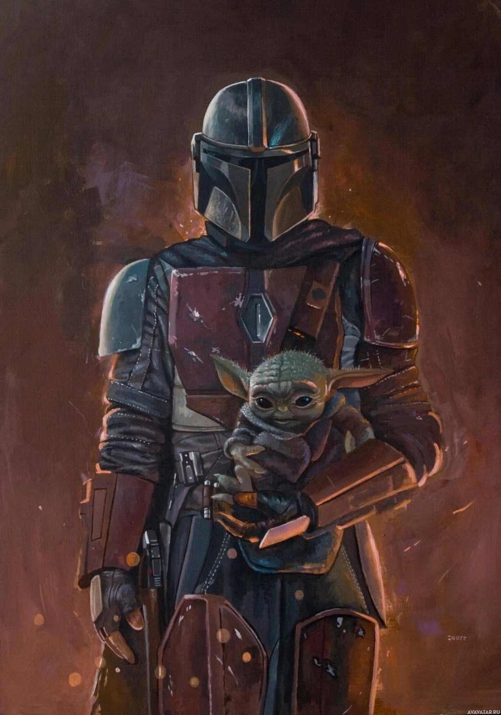 The image features a character in armor reminiscent of the Mandalorians from "