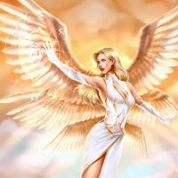 blonde hair and is wearing a white outfit that resembles armor or a costume. The character appears to be standing on a cloud, which adds to the celestial theme of her appearance. The background suggests a bright sky, possibly indicating an environment associated with angels or
