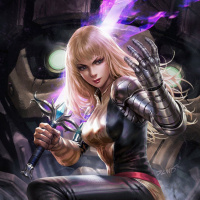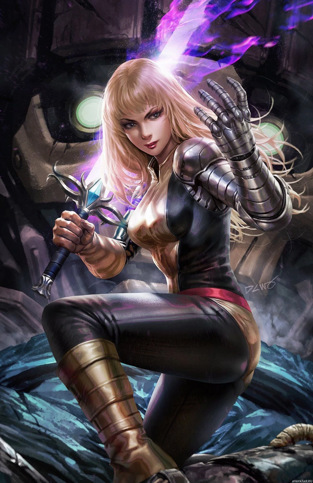 blonde hair and is wearing a black and purple costume, which suggests she might be from a comic book or science fiction setting. She's holding a sword in her right hand and is surrounded by what looks like robotic or technological elements, indicating that the scene may take place in a futuristic or