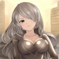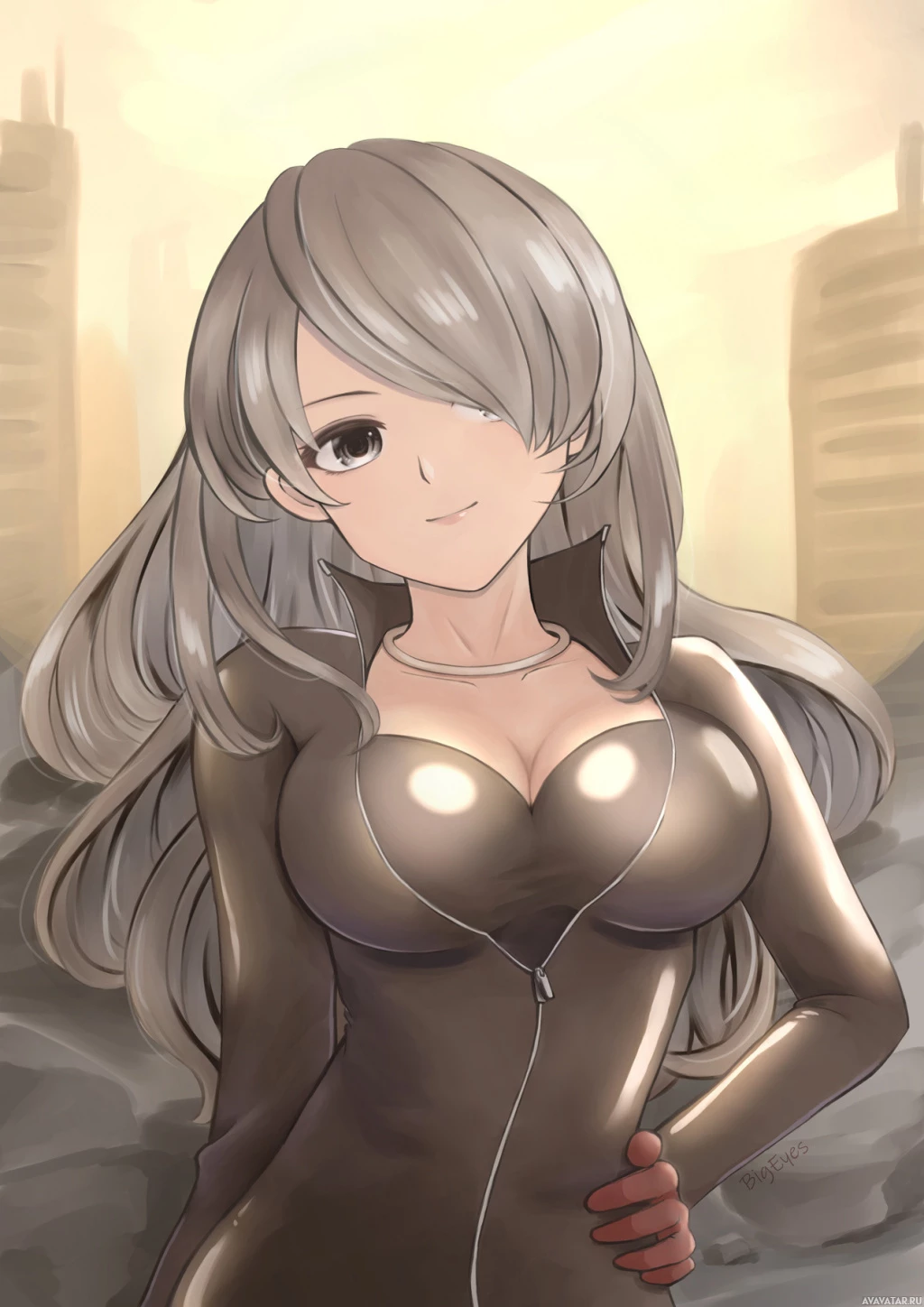 blonde hair and gray eyes. She is wearing a black bodysuit or leather costume that appears to be form-fitting with a visible zipper