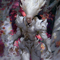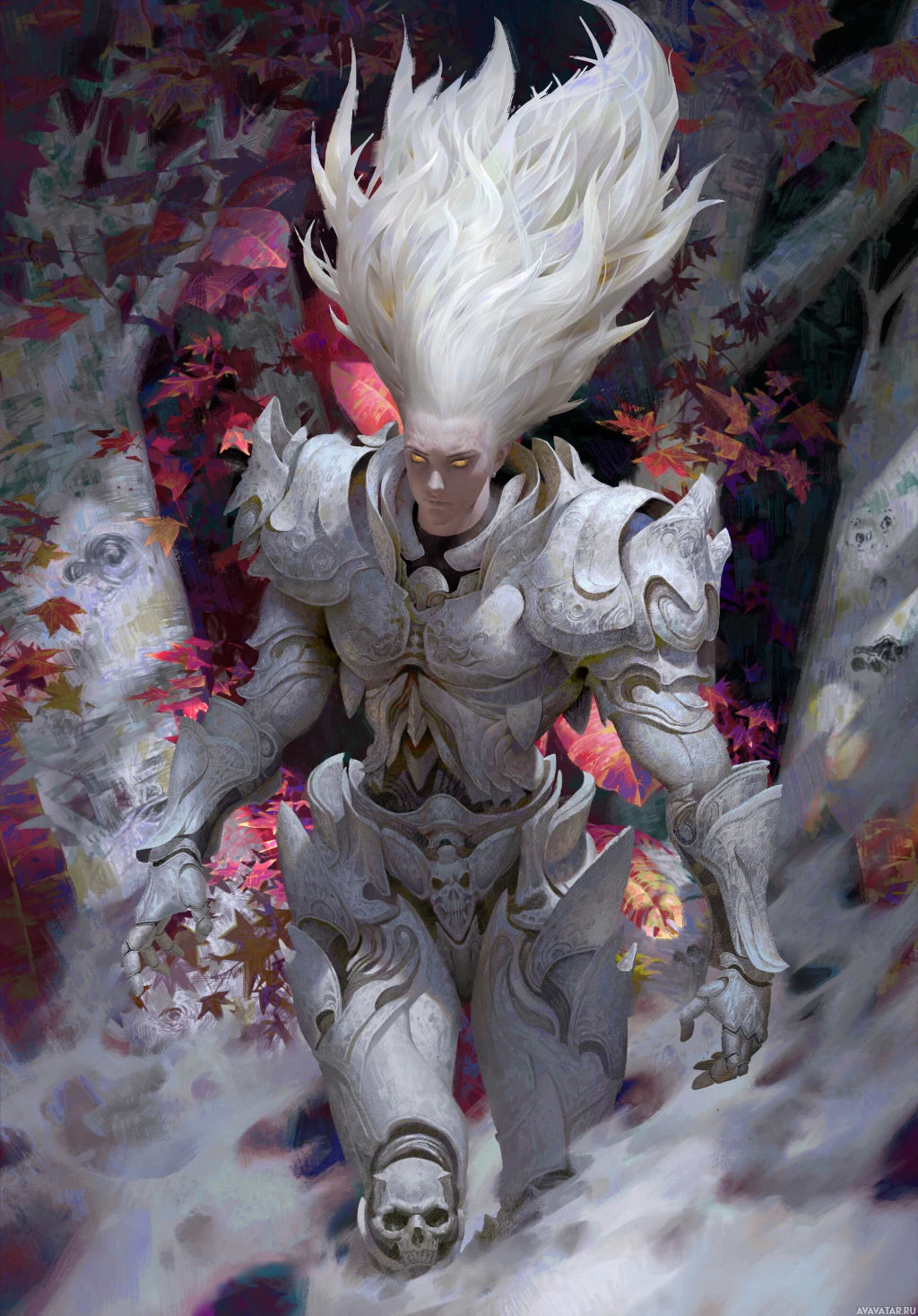 white hair. They are wearing armor and standing in an environment that appears to be autumnal, possibly inspired by the aesthetics of a forest or