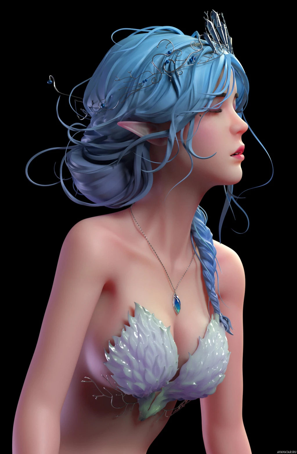 blue hair and is wearing what seems to be an underwater-themed outfit or armor, resembling the tail of a fish. This kind of imagery is often associated with