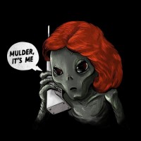 red hair and a worried expression. This alien is holding what appears to be a phone, suggesting that it might be communicating or interacting with someone on the other end. In the background, there's a phrase in a speech bubble that reads "Mueller, its me" followed by the word "alien," which humorously implies that this alien is pretending to be someone named Mueller while using
