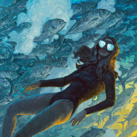 The image shows a woman submerged in water. She is wearing a wetsuit and has her hair floating around her due to the water's movement. Surrounding her are numerous fish, suggesting she might be underwater swimming or diving with