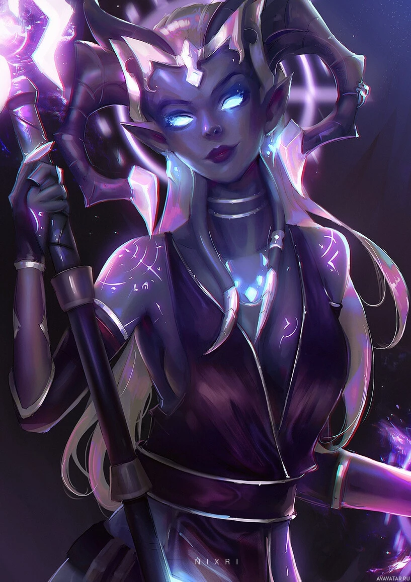 The image features a fantasy-themed artwork of a character. This character appears to be a female with horns, resembling a demon or