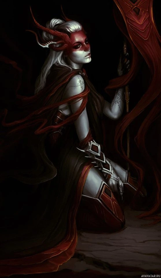 a fantasy character with white hair, wearing what appears to be dark makeup or a mask that gives her an eerie or demonic look. She is dressed in a black and red costume that resembles a mix of gothic and medieval elements. Her pose suggests she is in the midst of some
