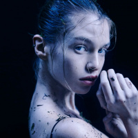 long hair that falls over one side of her head. The woman is looking directly at the camera, and she seems to be making a pensive or contemplative expression. There's a visible texture in the image that suggests it might be