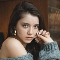 a knit sweater and has her hand under her chin, which may suggest a relaxed or contemplative pose. There are no visible tattoos or birthmarks in the photo provided.