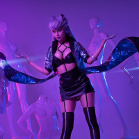 the video game League of Legends. The individual is standing against a backdrop of illuminated mannequins and is posing with one hand outstretched, while the other hand holds what appears to be part of the Seraphine's costume, creating an interesting