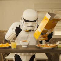 the Star Wars franchise sitting at a table with various breakfast items. The person is dressed in what appears to be a white