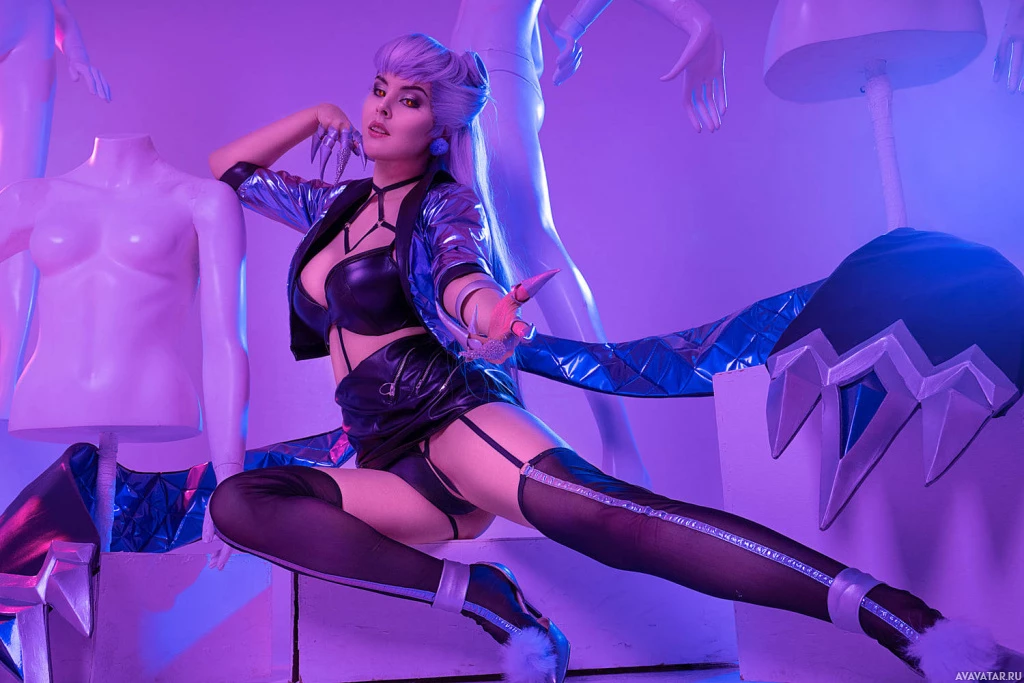 purple accents, complete with accessories like arm bands, gloves, and knee-high socks. They are seated on what looks like a mannequin torso with an exaggerated